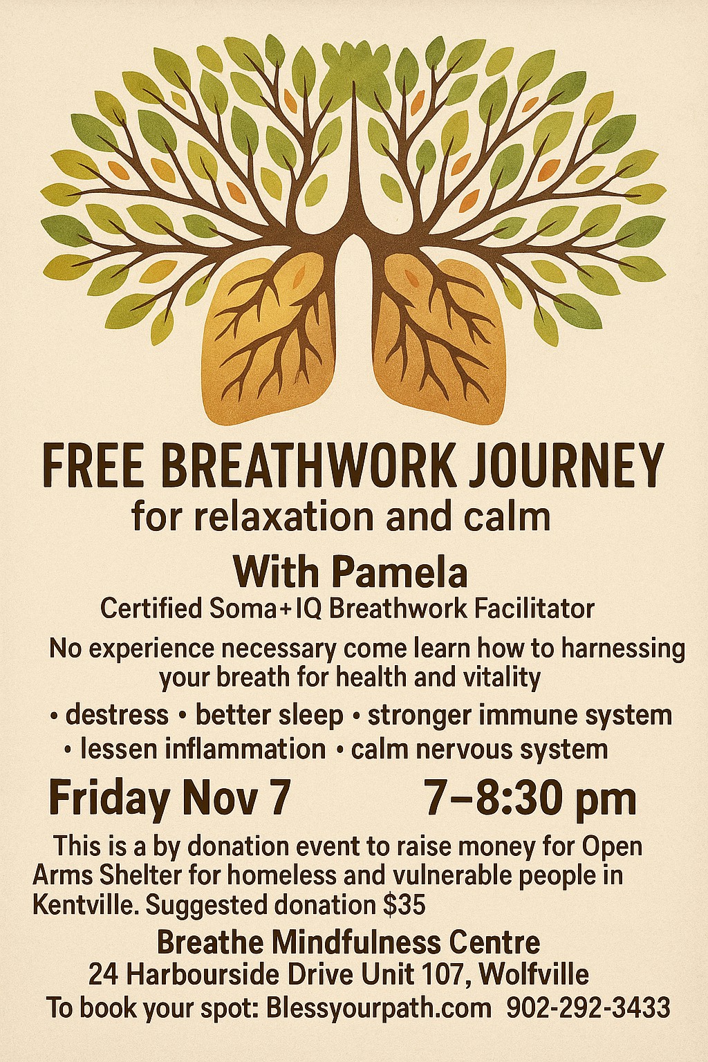 Sunday October 5th, 2025 3:00pm - 4:30pm Curious about breathwork and how it will benefit you? Release stress and tension Better sleep Become more resilient Nervous system regulation Inner peace This offering is a fundraiser for Open Arms Shelter in Kentville, and donations are welcome* *Suggested Donation: $35 To learn more or book: email: blessyourpath@gmail.com call: 902-292-3433 visit: blessyourpath.com *To […]