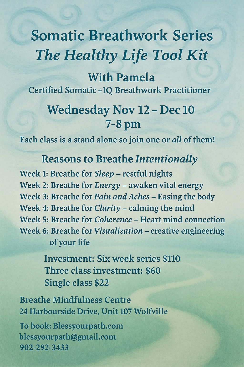 Friday November 7th, 2025 7:00pm - 8:30pm No experience necessary; come learn how to harness your breath for health and vitality: Destress Better sleep Stronger immune system Lessen inflammation Calm nervous system This offering is a fundraiser for Open Arms Shelter in Kentville, and donations are welcome* *Suggested Donation: $35 To learn more or book: email: blessyourpath@gmail.com call: 902-292-3433 visit: […]