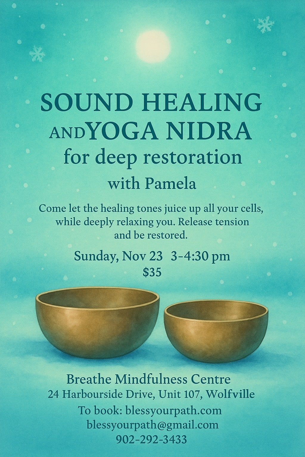 Sunday October 19th, 2025 3:00pm - 4:30pm Come let the healing tones juice up all your cells, while deeply relaxing you. Release tension and be restored. To learn more or book: email: blessyourpath@gmail.com call: 902-292-3433 visit: blessyourpath.com *To our valued clients: Please note that workshops and events at Breathe Mindfulness Centre may be facilitated by licensed mental health professionals […]