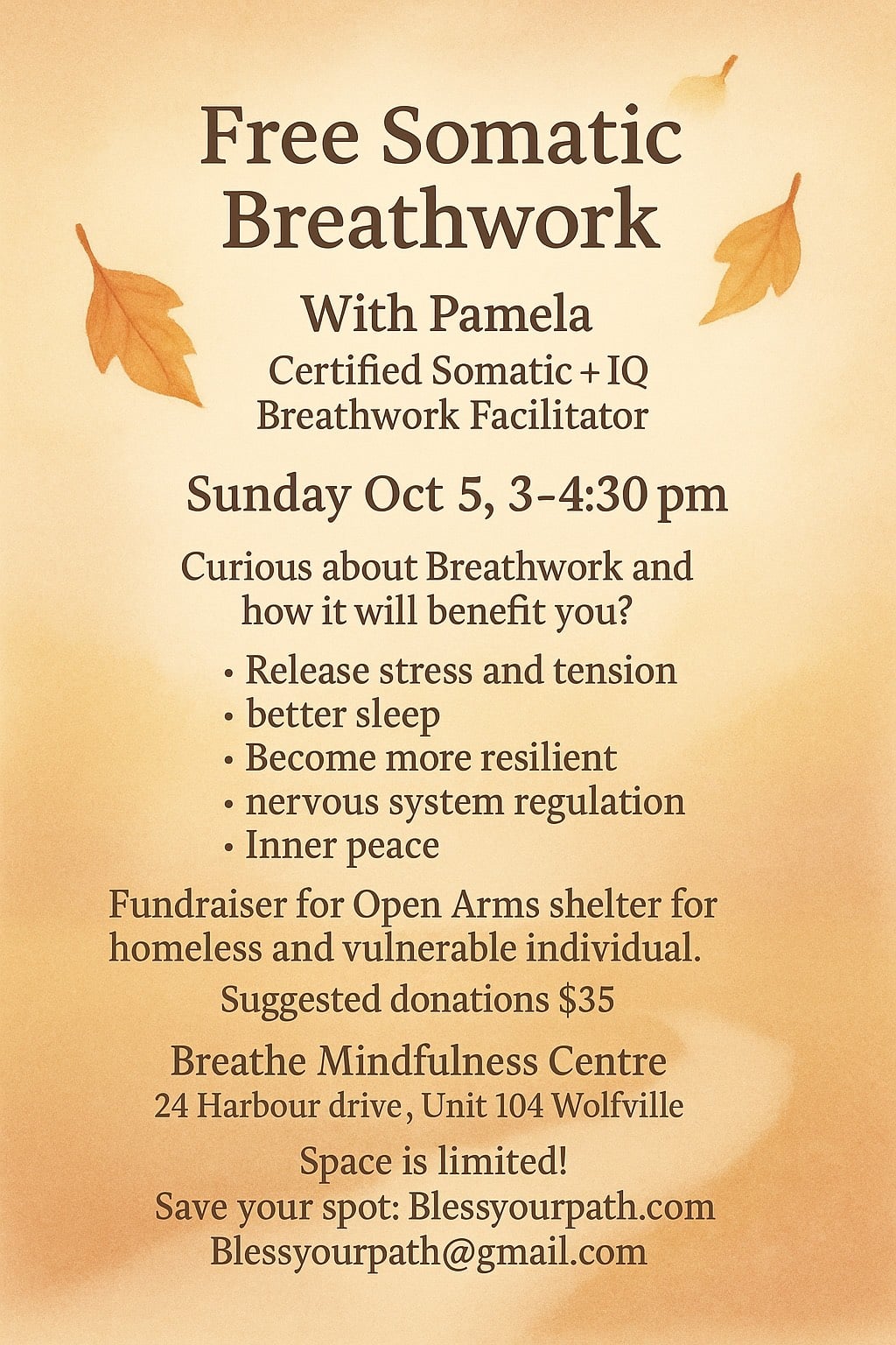 Sunday October 5th, 2025 3:00pm - 4:30pm Curious about breathwork and how it will benefit you? Release stress and tension Better sleep Become more resilient Nervous system regulation Inner peace This offering is a fundraiser for Open Arms Shelter in Kentville, and donations are welcome* *Suggested Donation: $35 To learn more or book: email: blessyourpath@gmail.com call: 902-292-3433 visit: blessyourpath.com *To […]